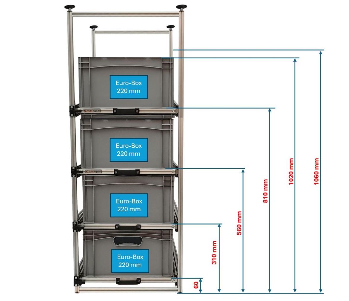 3 Regalböden x 55 mm = 165 mm, + 3 Boxen x 220 mm = 660 mm. Dies ergibt addiert 825 mm.