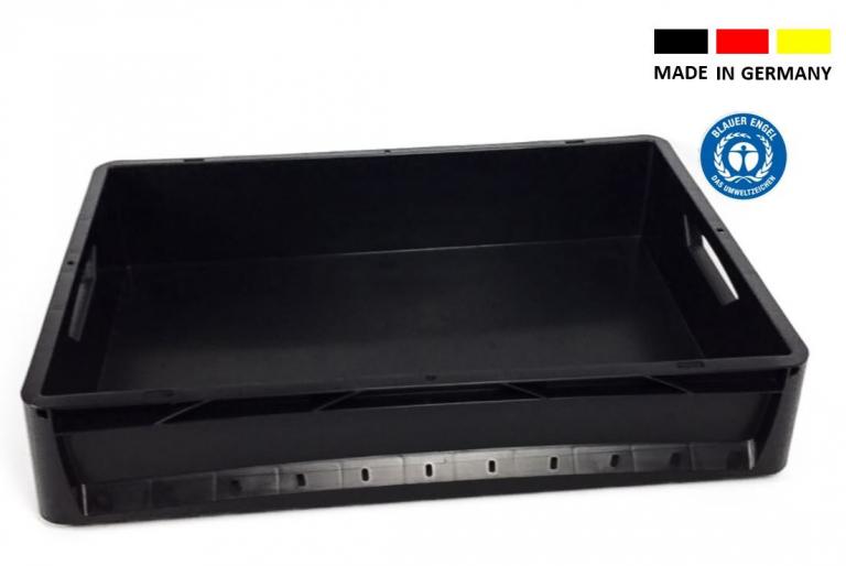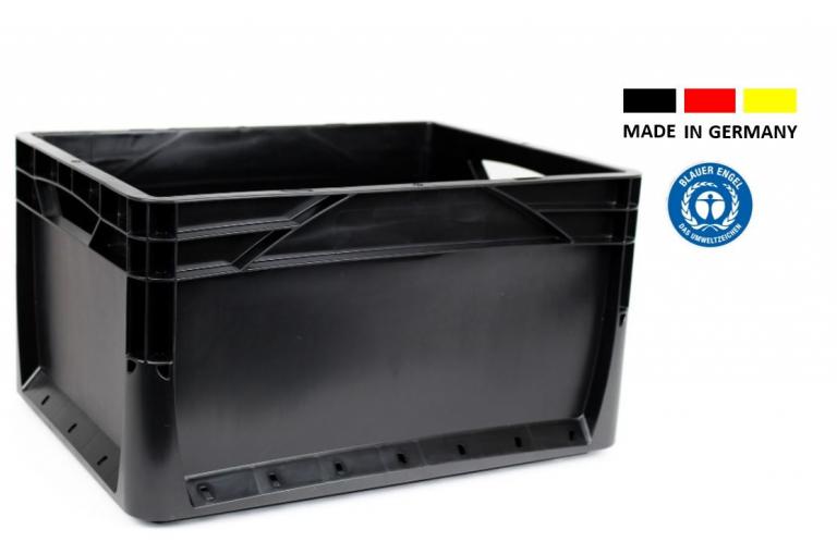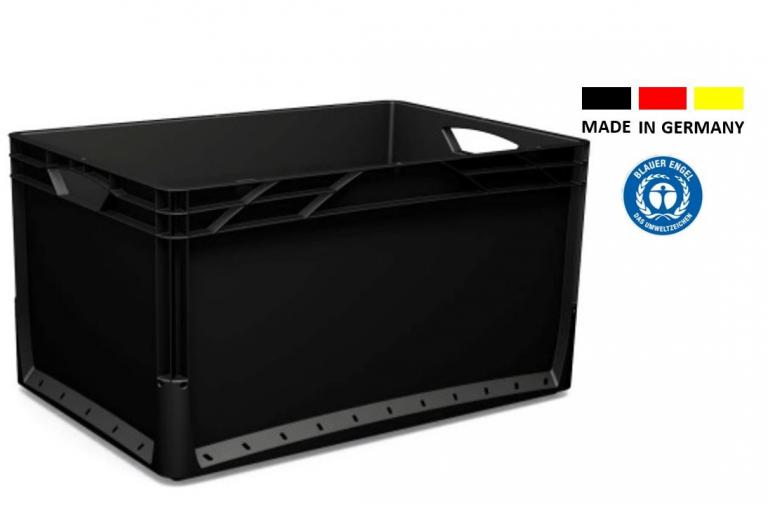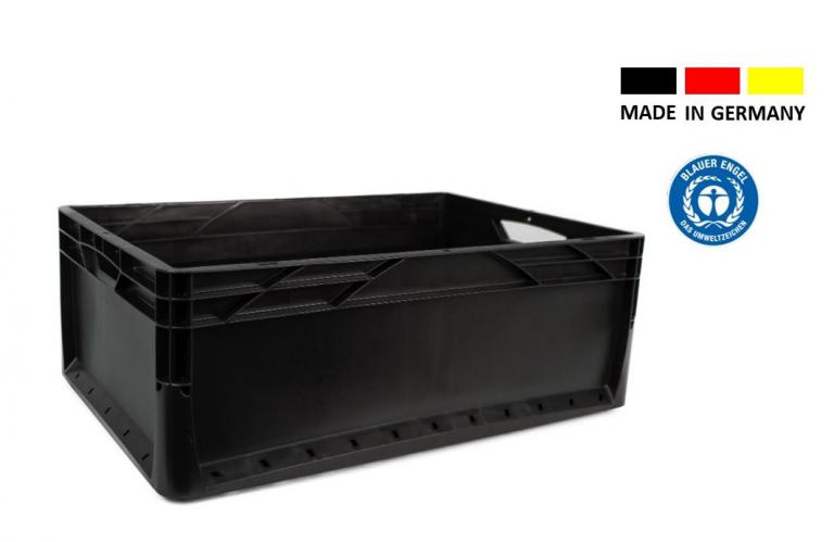 Bewusstes „ökologisches“ Stauen und Ordnen mit der nachhaltigen Euronormbox in schwarz aus Recyclingmaterial.