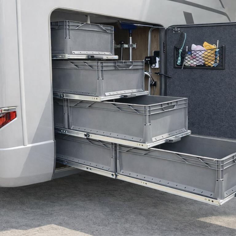 Dies ermöglicht, die Boxen mit Deckel und Scharnieren auf dem Auszug zu öffnen, ohne dass der darüberliegende Griff stört. Des Weiteren können die Auszüge weiter aus der Garage gezogen werden, was eine bessere Erreichbarkeit der Boxen ermöglicht. Rundum mehr Komfort bei den Auszügen von VOBI.